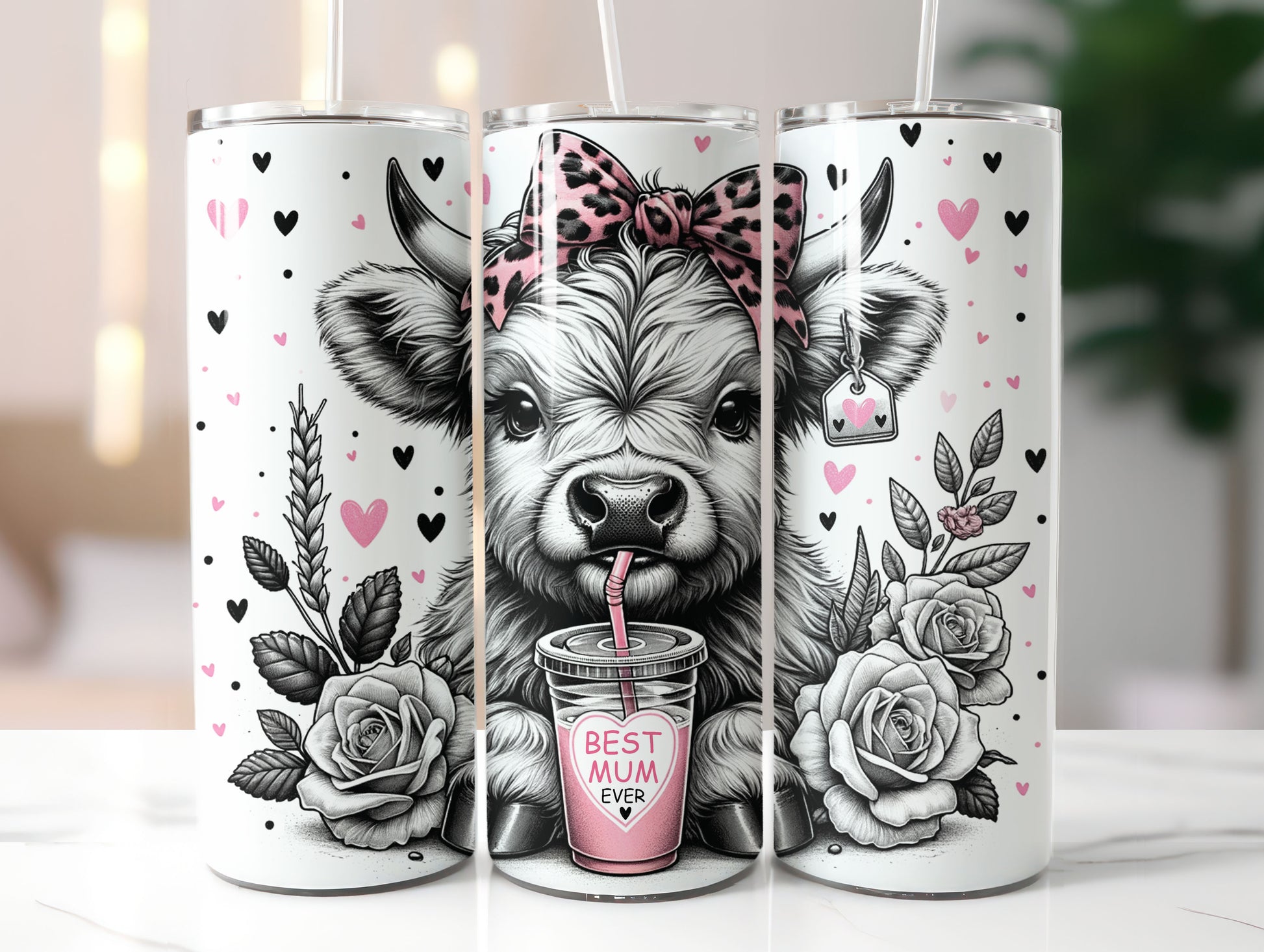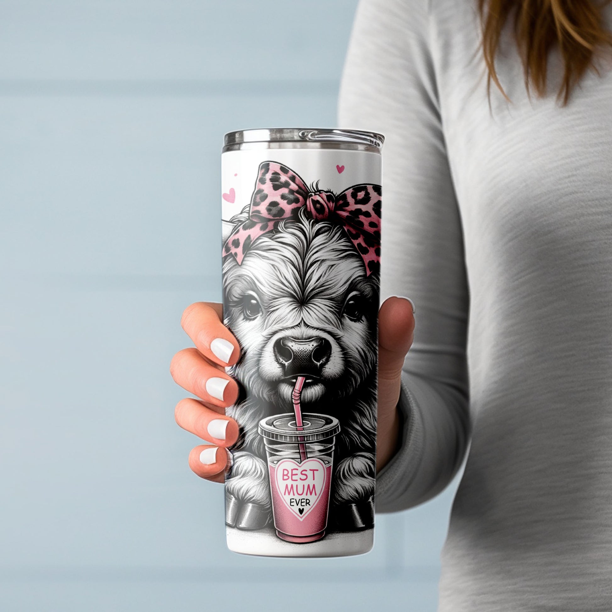 Celebrate your special mum with this heart-melting drinks tumbler. Featuring an adorable Highland Cow calf and the message 'Best Mum Ever', this charming cup is perfect for sipping coffee, tea, or cold drinks whether at home, on the go, or at work. Our 20oz skinny tumbler comes complete with both a metal and plastic straw. The plastic lid has a slider to open and close and it will keep your coffee hot and your water cold for hours. A heartwarming gift that any mum will love - perfect for birthdays, Mother's Day or just because!