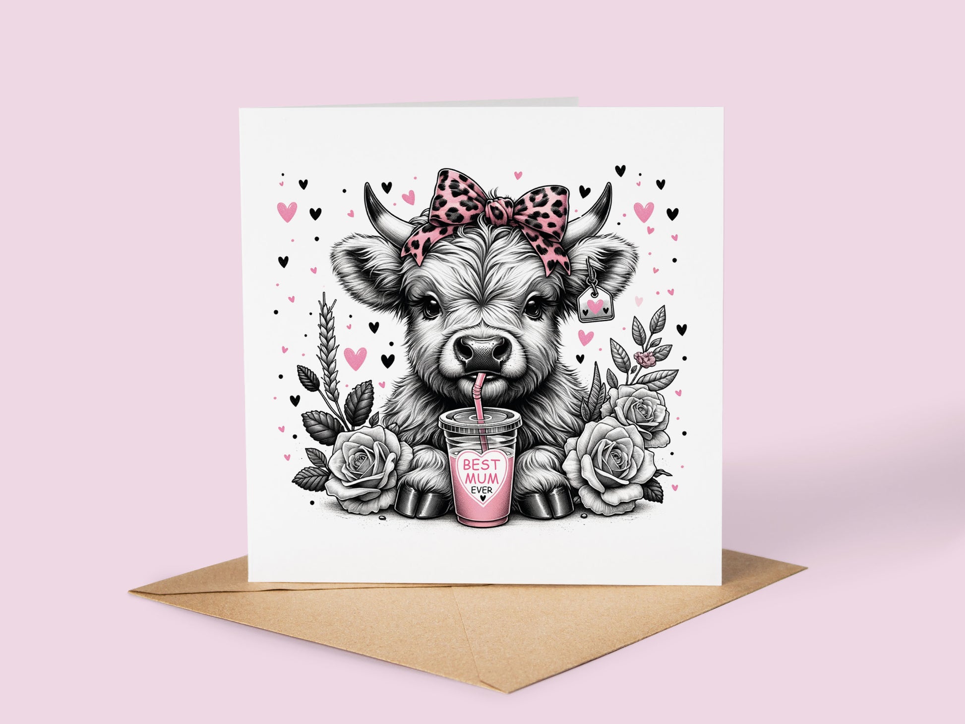 Celebrate Mum's special day with this adorable Highland Cow greetings card! Featuring a baby cow with a cute bow the heartfelt message reads 'Best Mum Ever.' This card is the perfect way to show your love and appreciation to your fabulous mum on her birthday or for Mother's Day!
