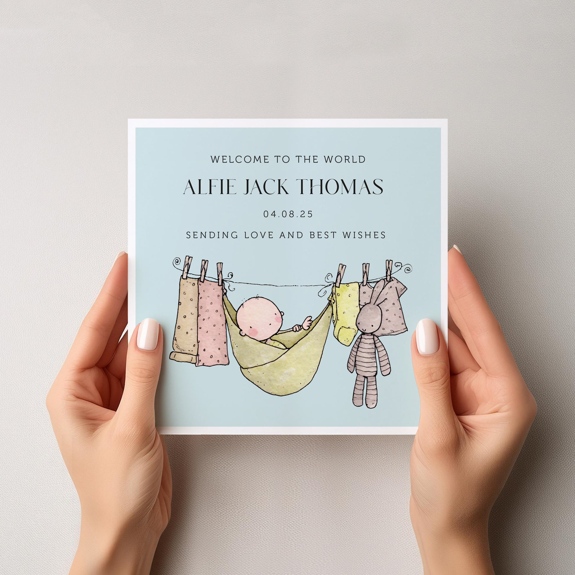 Welcome the arrival of a beautiful little boy with this gorgeous card! The card is personalised with baby's name and date of birth and the wording 'Sending love and best wishes'. Featuring a cute baby and a washing line full of tiny clothes, this card makes the perfect keepsake for the new parents.