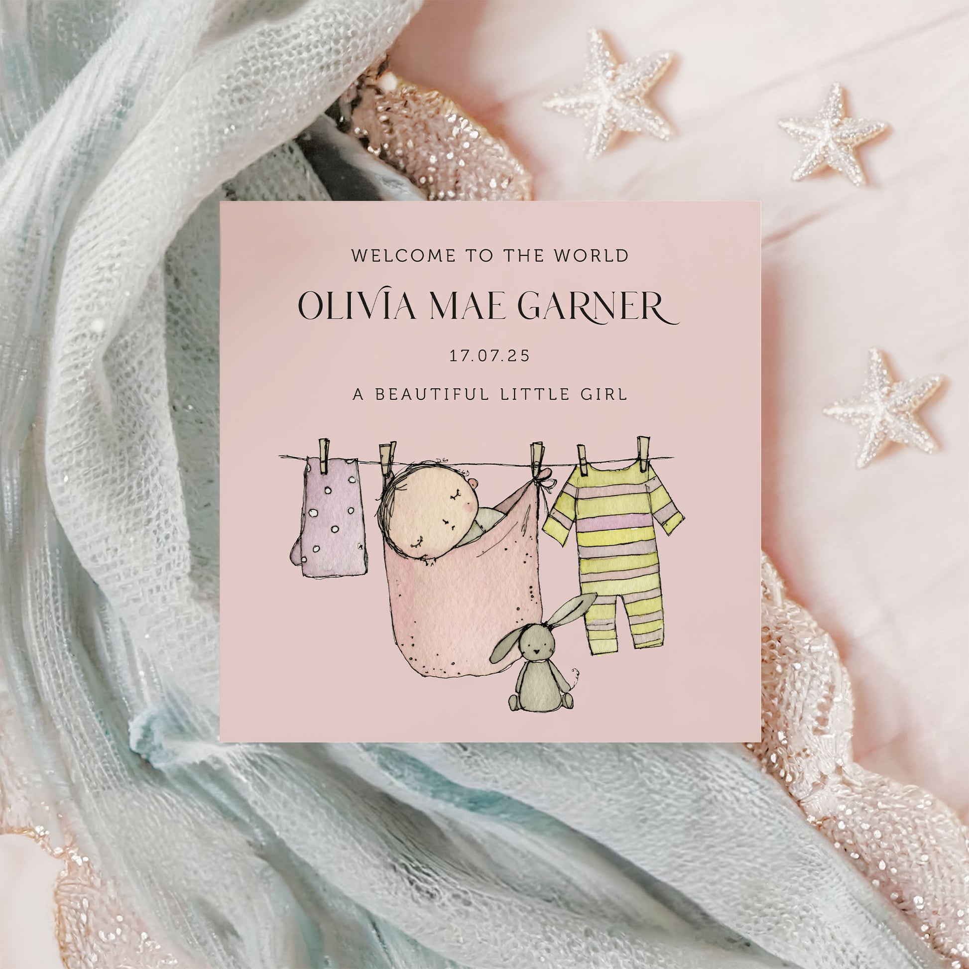 Welcome the new arrival with this gorgeous card! The card is personalised with baby's name and date of birth and the wording 'A beautiful little girl'. Featuring a cute baby and a washing line full of tiny clothes, this card makes the perfect keepsake for the new parents.