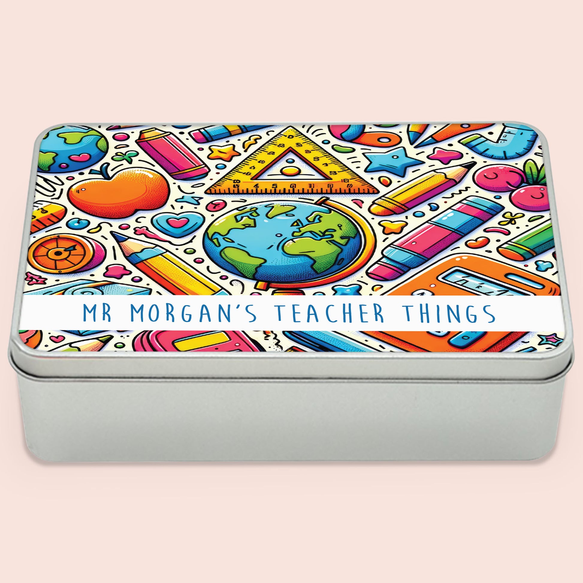Are you looking for the perfect thank you gift for your child's teacher? This quirky tin will keep all of their bits and bobs safely in one place making their busy schedule a little easier. Bright and colourful and personalised with their name on the lid of the tin. Let them know how much you appreciate them with this practical and useful token of gratitude.